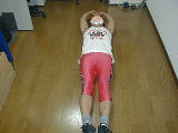 ・仰向けに寝て両手を上方に組み、ギュウ〜っと身体を伸ばす。