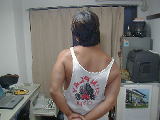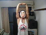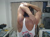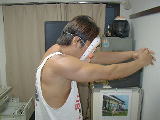 ・後ろ手に肘を持ってゆっくり引っ張る。ちからこぶの裏側の筋肉とわきの下が伸びる。