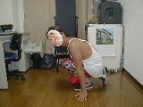 ・身体をやや前屈し、膝を床につけるように両手の肘でゆっくり押す。