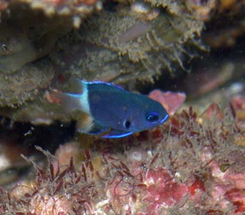 シコクスズメダイ幼魚 なかなかきれいな魚です。 臆病で撮りにくいのですが今年は数が多いので近づいて撮れる機会を待ちたいと思います。