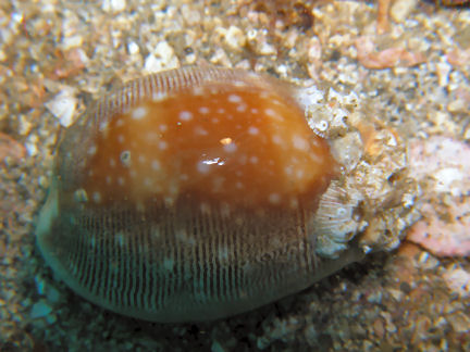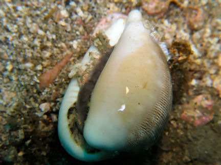 ホシキヌタ 生貝 殻にフジツボがついています。「タカラガイ・ブック」で生きているときに付着することがあると知って撮りました。
