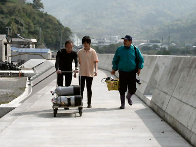 海里DSから港まで車で10分くらい。右は電気屋さんもやれば、漁師もやるという、やさしくて頼りになる高橋さん。