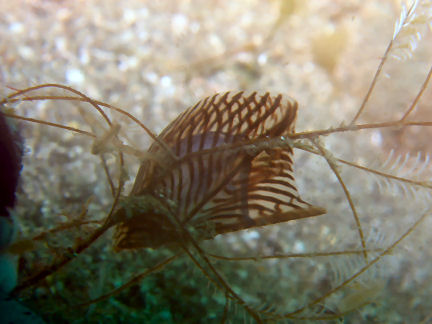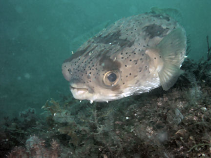 ハリセンボン タイヤ漁礁にいました。レンズを向けると物陰へ隠れ、こちらが息を潜めるとこわごわと覗きに来る。しばらく遊ばれてしまいました。