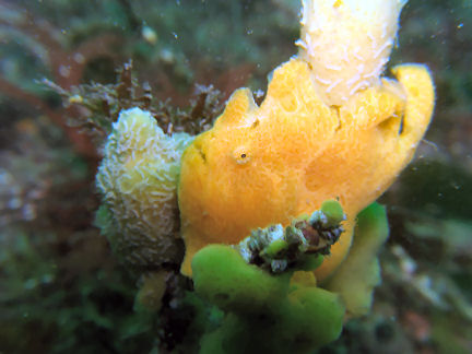 カエルアンコウ カイメンにはさまり、気持ちよさそうです。
