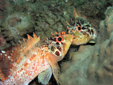 イソカサゴの喧嘩。もっと激しくやり合うかと期待したらパッと離れてしまいました。鰭の立て具合が「怒」という感じ。