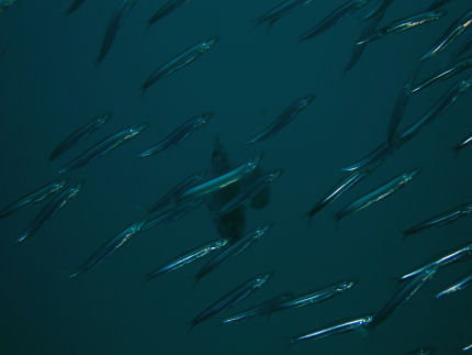 キビナゴ?とマハタ 後の黒いのがマハタです。この他、イナダにアオリイカが群れを襲っていました。