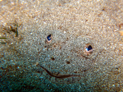 マゴチ 砂に潜って餌待ちのようですが、どうも緊張感が感じられません。前にも撮ったけれど右は眼です。