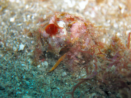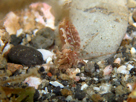 オドリカクレエビ 大きい個体。小カロウ根の北の砂地で。回り道している間にキムスメダカラを拾われてしまいました。エビに責任はないのですが......。
