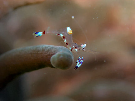 アカホシカクレエビ 珍しくイソギンチャクの触手の先端にいました。