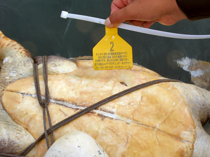 カメ 坂田港の沖に漂っていた死骸です。南無〜。 タグをつけて放すらしいです。