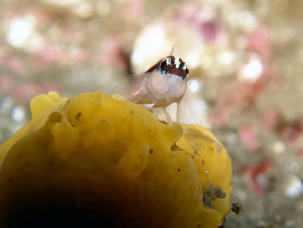 イチモンジハゼ 黄色のきれいな海綿に乗っかってこちらを向いてくれたおかげできれいに撮れました?
