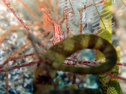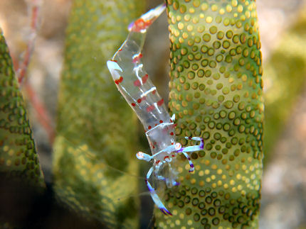 ハクセンアカホシカクレエビ 上のミズヒキガニと同じスナイソギンチャクにいました。緑色のイソギンチャクといい対比です。