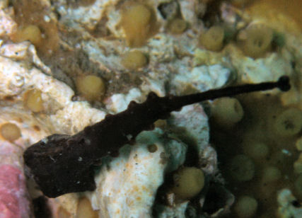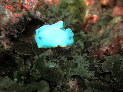 ヒル? 小さな岩の裏にくっついていました(右)ウミウシにしては変な感じがしたため棒でつついたら、突然、早い動きで触手?吸盤?を伸ばしました。(左)