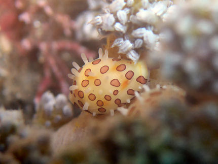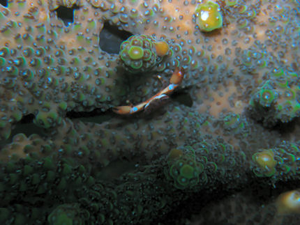 サンゴガニ 「The World」で。ミナミイソハゼらしいイソハゼは姿を消してしまい、定番のサンゴガニです。なんで寄って撮らなかったんだろう??