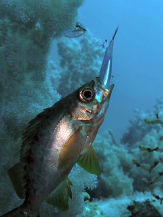 カロウ根で2匹いてトサカのポリプ?をつついていました。