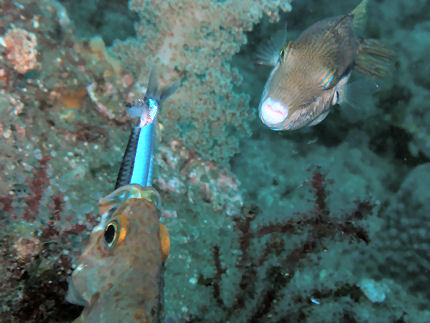 潜水中だんだん上げ潮が早くなり、オランウータンクラブはまたも見つからず、キバナトサカも見失い、しまいにはMarkさんからオランウータンクラブは3本目に確認し、ミナミハコフグ幼魚もいたとのことでがっくり、海に身投げしたくなりました(器材しょって♪)。