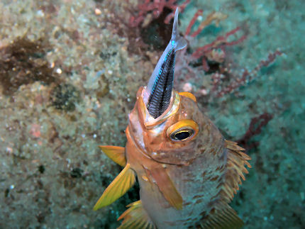 メバル 食べたいのはわかるけどキビナゴが大きすぎじゃないのか?撮っているうちにキタマクラが寄ってきて端っこを毟っていました。