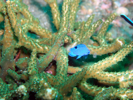 ナガサキスズメダイ ではなくミドリイシを紹介したくて撮りました。カロウ根に2つくらいあったかな?あまり生物は居つかないようですが、でも何が出るかわからないのが海です。