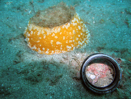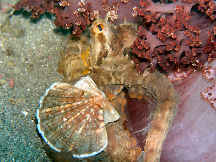 ロープ際で黄色のカエルアンコウと貝を抱えたマダコを撮っていたらDECが出てしまいました。ゆっくり減圧してEX。心配しましたが「体がカユく」ならずによかったぁ