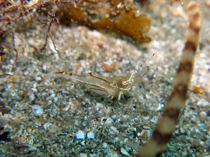 アカスジカクレエビやコガネスズメダイ幼魚、アジアコショウダイ幼魚。