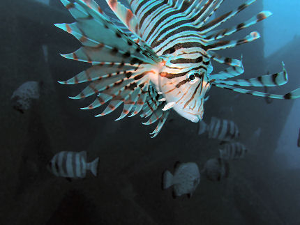 イシガキダイ ミノ漁礁で。撮っていると案の定ミノカサゴが顔の横に。一体何がしたいのか??