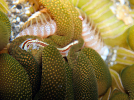 スナイソギンチャク 手前の縞々は小魚です。いつもはぼや〜んとしたスナイソギンチャクが一瞬で魚をからめとりました。