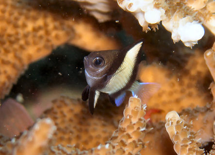 新漁礁に戻って安全停止中にタカサゴスズメダイかトサスズメダイの幼魚がいましたが時間が来てしまい後ろ髪を引かれながらエキジット。