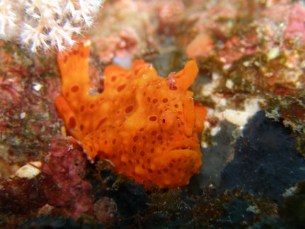 クマドリカエルアンコウ オオモンと言ってしまいましたが、画像で一番飛び出ている3棘がマッチ棒状であること、Booさんの撮られた画像ではクマドリが判ることからクマケロのオレンジ色としました。