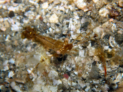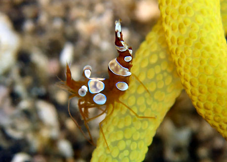 オシャレカクレエビ スナイソギンチャクの脇で見つけ、最初は初見のエビ!と勘違い。正体はオシャレカクレエビの瀕死状態でした。体にコケ?が生えていました。南無。
