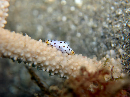 あつじのガイドで西回りでゆっくりミノ漁礁へ。浅いところは帯のように濁ってしまっていました。その中にはクロサギの群れ。濁りを抜けてビシャモンエビペア。穴が開いたトサカでタマオウギガニを確認。ここで大きなテンロクケボリを拾いました。