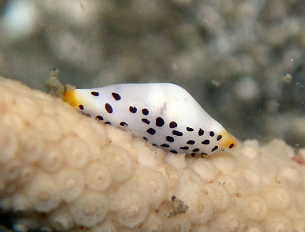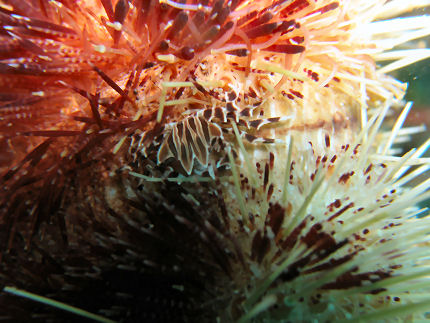 漁礁からアワビカゴ近くのハクセンアカホシカクレエビを見せてもらい南下。ミノカサゴが2匹くっついてきます。イイジマフクロウニについたゼブラガニ、ムラクモコダマウサギ、ムラクモキヌヅツミを撮ってあつじは喜んでいました。昼にあつじにスジの入った怪しいテンロクを見せてもらい自分もテンロクを拾ったのを思い出し、ひっくり返すと「ノコギリバケボリ」ぽい!やったぁ。