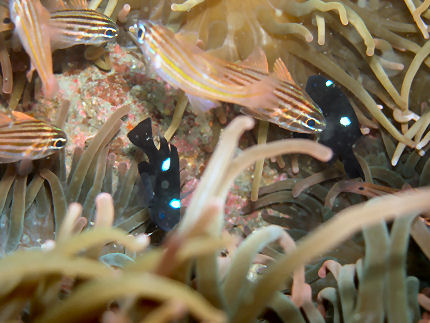 ミツボシクロスズメダイ幼魚 まだ数箇所で頑張っています。