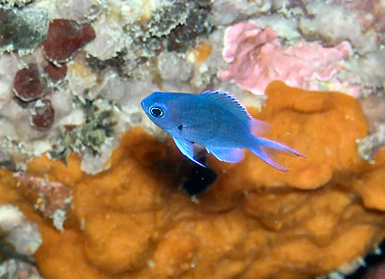 ミツボシクロスズメダイ幼魚 坂田と比べると体が薄くて別の魚みたいです。