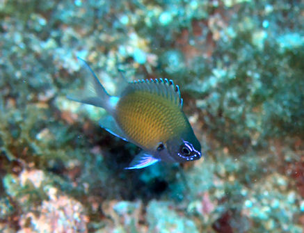 アマミスズメダイ若魚 幼魚というにはちょっと大きすぎですがエレクトリックブルーがまだきれい。そういえば当初目標のスズメダイは全然覚えずじまいでした。