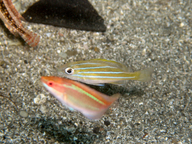 | ひと言: ときおり現れてくれるいかにも南方系のお魚です。暖かい海にいっぱい群れているのを見ると見飽きないですね。形もかっこいいです、願わくばヨスジフエダイに酷似するベンガルフエダイを坂田で見つけたいです、フィッシュウォッチングは際限がなく書いているだけでまた潜りたくなってきます。 |