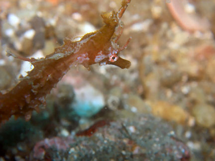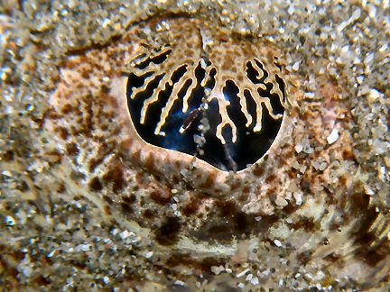 マゴチ 砂に潜って餌待ちのようですが、どうも緊張感が感じられません。前にも撮ったけれど右は眼です。