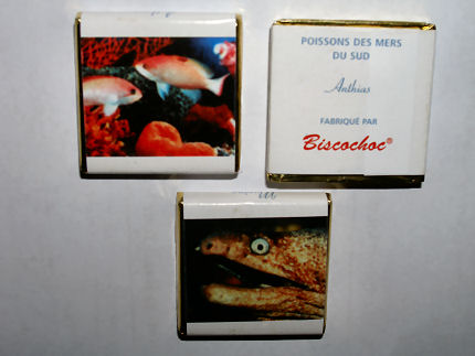 ニューカレドニアのチョコ 職場のおみやげ 「Anthias」「Murene」(仏語)とあり「ハナダイ」「ウツボ」ですね。埋め草画像です