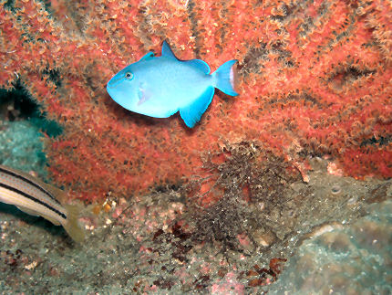 アカモンガラ幼魚 こちらも撮り直し。中層を泳いでいるほうがそれらしいのでヤギが背景はご愛嬌ということで。