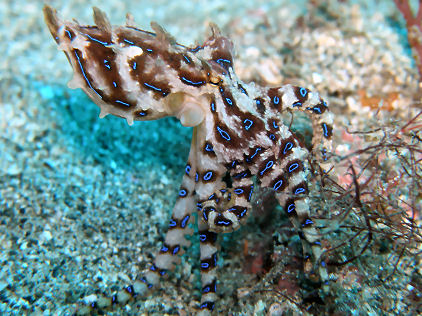 ちょっと変わったイカが泳いでいるなあと思って見ていたら着底すると色が変わりヒョウモンダコに。