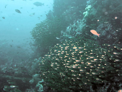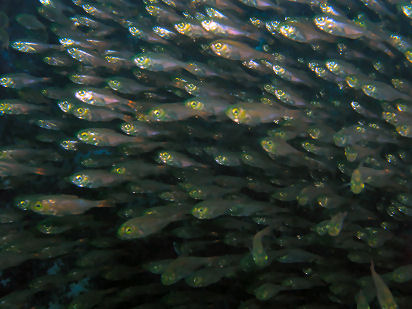 新新漁礁で見られます。近づくとモビングのように動いて迫力があります、右の画像では判りにくいのですが奥にももう一群れいます。