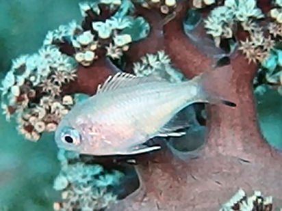 でこの子はササスズメダイじゃないかと思うのですがカロウ根にも似た子が数匹いてそちらはスズメダイの中に混じっているのにこちらや新漁礁では単体なのとササスズメダイは個体数が少なめで「こんなにいるの?」という気がします、結果がわかってタカサゴスズメダイだったら苦労した割りにちょっとがっかりかも。