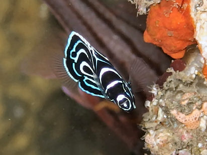 ソメワケヤッコを撮って、(撮れなったから見ていてに訂正します)いたら近くにいた死滅回遊のトラギスです。黒いスジで悪人面ですね。
