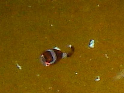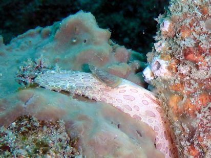 カロウ根の天辺近くで紋様のある軟体系(画像左)の生物を見つけました。出だしから妄想が全開で「おぉ~初めて見るウミウシだ、しかも大きい!!」と。そして体の中央の薄いゴミみたいなものは「これは貝殻が外に出ているのだ」と勝手に思い込みバシバシ撮りまくりです。ちょっと落ち着いた所でちょっとツンツンすると、なんとあっという間に軟体部は右側に引っ込み、貝殻だと思ったのは貝の蓋になってしまいました。