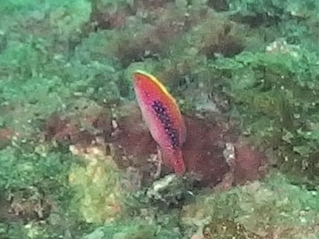 まったく別種の魚が一緒にいるのはよくある事でイソカサゴもアナハゼも捕食魚(フィッシュイーター)なので納得はするのですがアナハゼはホバリングして狙うこともできる戦闘ヘリ的なのにイソカサゴは歩兵なみの底べったりでせいぜいヤギにとりつくぐらいしかできないので不思議だなあという事で載せました。ちなみに、このアナハゼは何アナハゼとかはわかりませんのですみません。