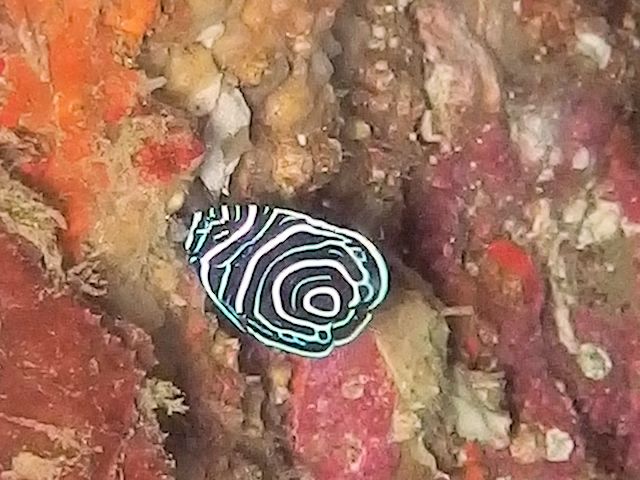 2013年に松根で出たのですが会えずじまい。そろそろかなあと狙いをつけてゆっくり探ってズバリ見つけたのですがハタ科の例に違わず数枚撮ると引っ込んでしまい終了。午後、満を持して待ちに入りましたが、どうも出てくる感じがない上に、向こうからウツボが泳いできました。普段はウツボなんて寄ってこないのに、こっちに来るなよと思ったの反して巣穴の横(画像ではちょうど首の左側)にあたかもおばさんが電車の座席に腰を下ろすかのごとくドスンと着底しハーハー息を入れ、こっちをしげしげと見ていて動く様子がありません。埒がないのでフラッシュを炊いたらやっとどいてくれましたがハタは撃沈です。
